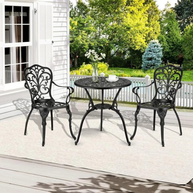 Durable Outdoor Dining: This 3-piece bistro set is crafted from heavy-duty cast aluminum, ensuring rust-proof performance and resilience against all weather conditions for lasting outdoor enjoyment.