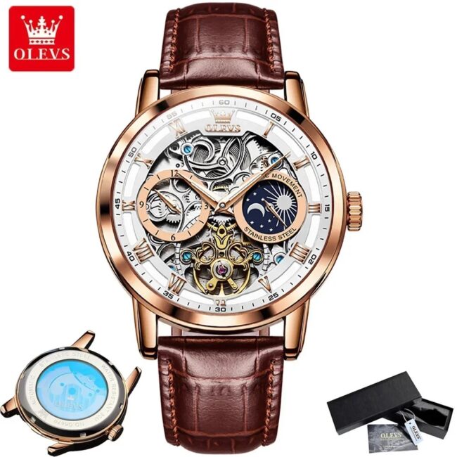 OLEVS 7051 Fashion Men’s Watch Leather Strap 30M waterproof Hollow HD Luminous Automatic Mechanical Wristwatch for Men