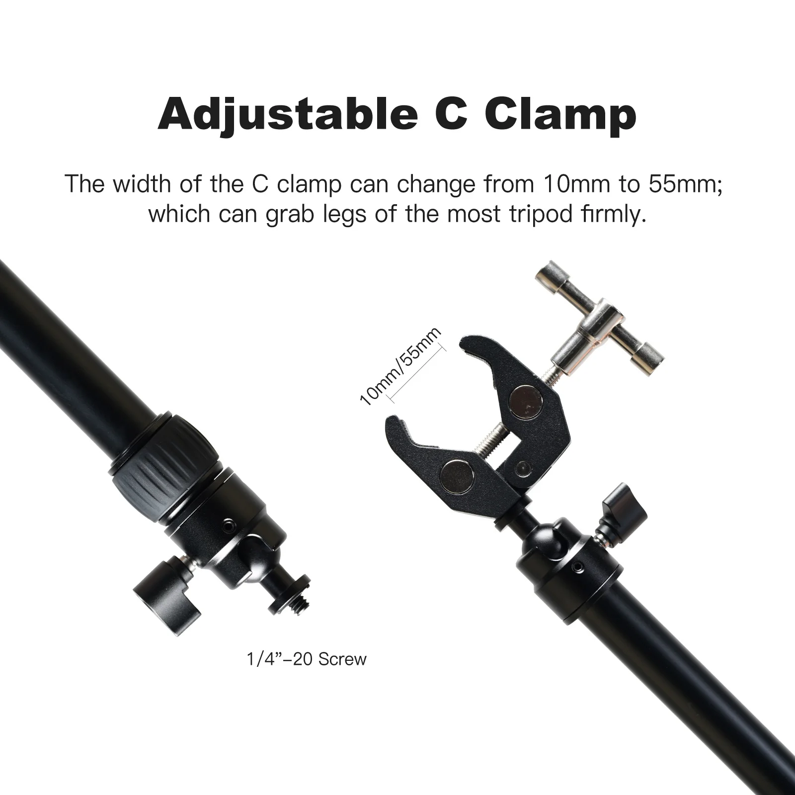 - 【Adjustable C Clamp】The width of the C clamp can change from 10mm to 55mm,which can grab legs of the most tripod firmly.
