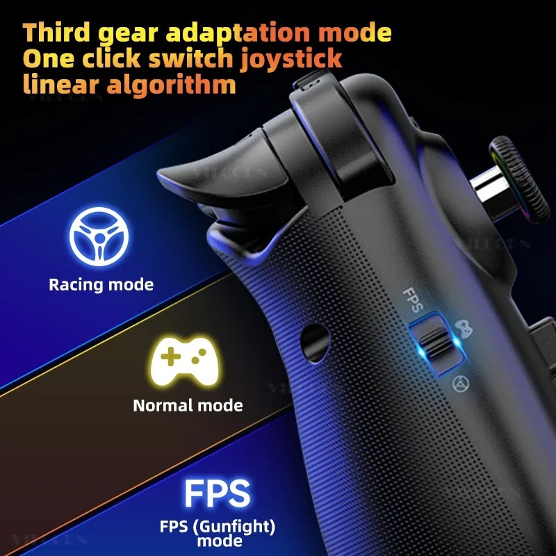 6. Three-gear adaptation mode (FPS(gunfight) mode, normal mode, racing mode), one-click switch joystick linear algorithm.